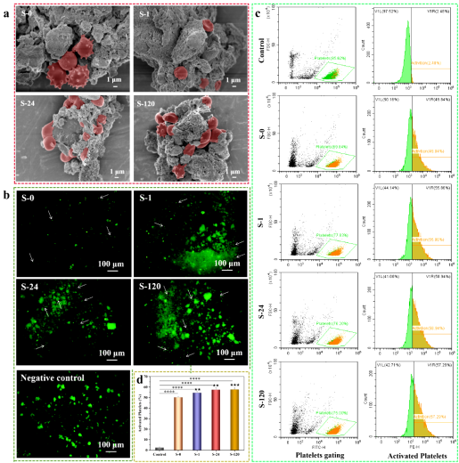 因此,通過(guò)研究紅細(xì)胞在混維凹凸棒石黏土表面黏附和血小板激活情況,結(jié)合黏附紅細(xì)胞數(shù)量、形態(tài)和血小板活化率,進(jìn)一步證實(shí)了S-1具有最佳的止血性能。