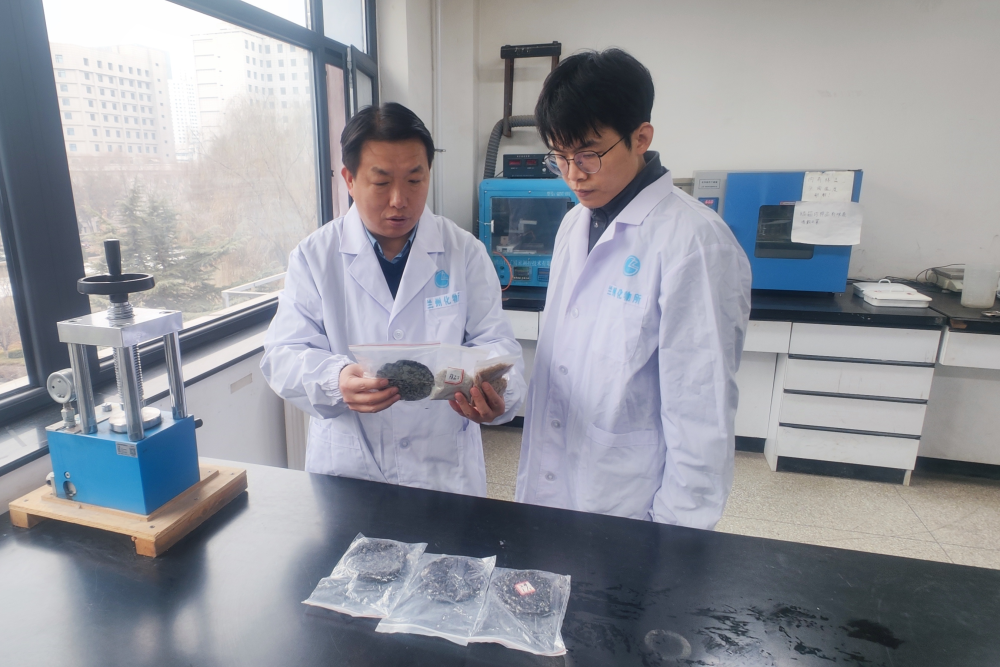 2024年12月26日,唐志誠研究員(左一)在中國科學(xué)院蘭州化學(xué)物理研究所實驗室里向團(tuán)隊成員介紹處理后的風(fēng)機(jī)葉片材料。受訪者供圖