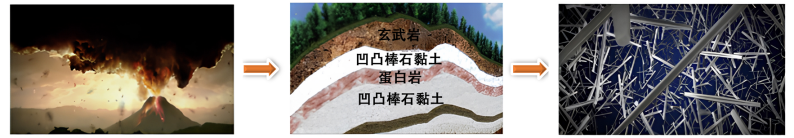 凹凸棒石的“分子身份證號(hào)”為Si8Mg5O20(OH)2(H2O)4·4H2O。它誕生于白堊紀(jì)至第三紀(jì)漫長的地質(zhì)演化過程中,是火山沉積、熱液蝕變與漫長風(fēng)化共同孕育的結(jié)晶。歷經(jīng)億萬年錘煉形成的獨(dú)特結(jié)構(gòu),至今仍是人類難以合成的自然杰作。