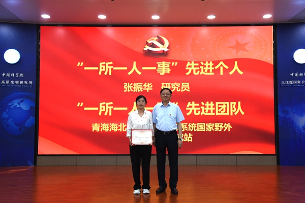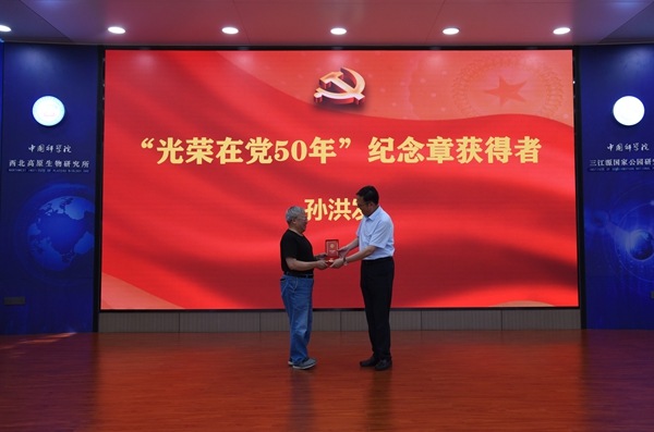 會(huì)議第二階段,在雄壯的國歌聲中,西北高原所召開慶祝建黨103周年表彰大會(huì)。楊勇剛宣讀了《中共中國科學(xué)院西北高原生物研究所委員會(huì)關(guān)于表彰先進(jìn)黨支部、優(yōu)秀共產(chǎn)黨員和優(yōu)秀黨務(wù)工作者的決定》。首先,所長陳世龍向?qū)O洪發(fā)同志頒發(fā)“光榮在黨50年”紀(jì)念章,代表所黨委向?qū)O洪發(fā)同志表示祝賀,并對(duì)他多年來為黨的事業(yè)盡心竭力、無私奉獻(xiàn)致以崇高的敬意。