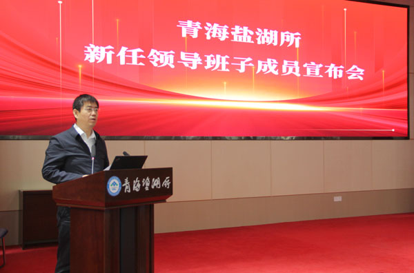 7月5日,中國科學院人事局副局長蔡宏志帶隊宣布中國科學院青海鹽湖研究所新一屆領導班子任命。青海鹽湖所新老領導班子成員、黨委委員、紀委委員、中層正職、黨支部書記及正高級科研人員等40余人參加了宣布會議。蘭州分院副院長、分黨組成員趙培慶出席并主持會議。
