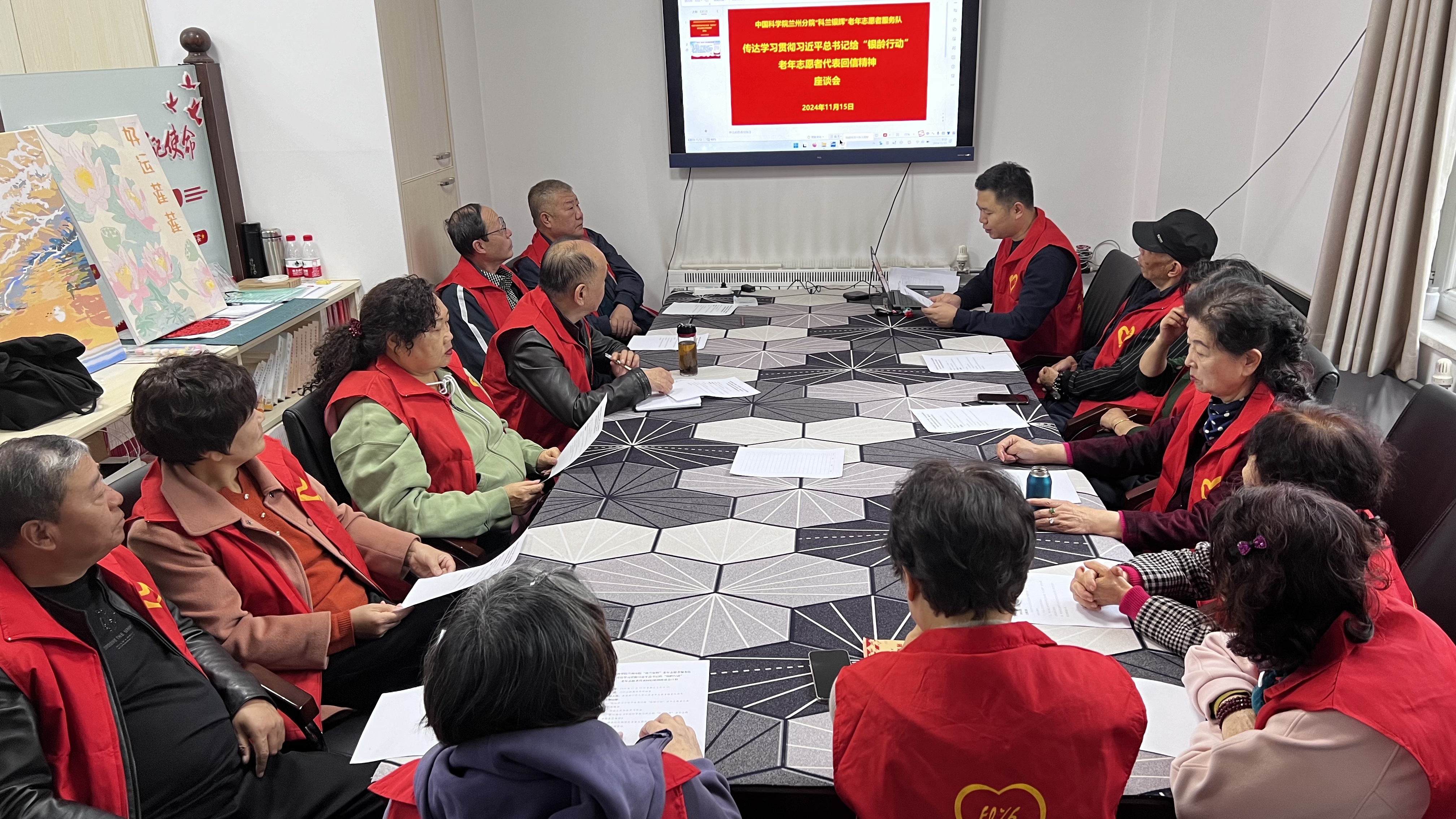 為進(jìn)一步夯實思想基礎(chǔ),激勵擔(dān)當(dāng)作為,11月15日,中國科學(xué)院蘭州分院“科蘭銀輝”老年志愿者服務(wù)隊組織開展系列活動,深入傳達(dá)學(xué)習(xí)貫徹習(xí)近平總書記給“銀齡行動”老年志愿者代表的回信精神。