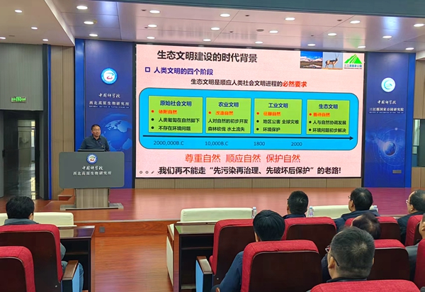 隨后,黨委委員、高原生態(tài)學研究中心主任徐世曉研究員向參加活動的黨員作了“致力高原生態(tài)學研究 助力生態(tài)文明發(fā)展”專題報告,報告從生態(tài)文明建設(shè)的時代背景,國家戰(zhàn)略需求、青藏高原生態(tài)安全屏障重要作用等三方面,詳細介紹了西北高原所針對高寒區(qū)生態(tài)系統(tǒng)脆弱性、敏感性,生態(tài)保護和可持續(xù)發(fā)展開展的一系列研究和取得的成果。通過大量案例和數(shù)據(jù),讓大家深入了解了生態(tài)修復、綠色產(chǎn)業(yè)發(fā)展的成功經(jīng)驗,深刻認識到科學保護青藏高原生態(tài)系統(tǒng)、推動綠色發(fā)展的重要性。