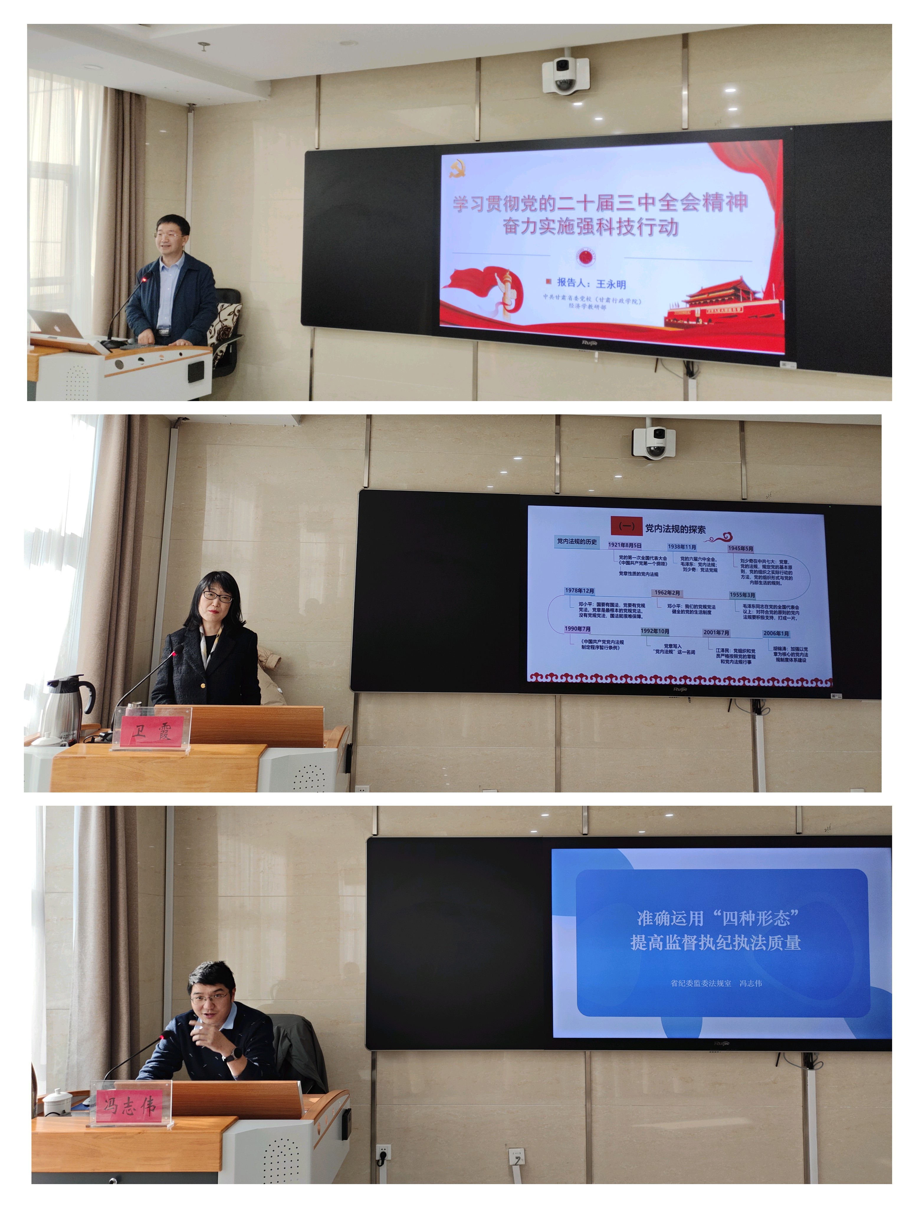此次培訓(xùn)結(jié)合工作實(shí)際設(shè)置了三場專題報(bào)告、三場經(jīng)驗(yàn)分享和兩次警示教育。中共甘肅省委黨校(甘肅行政學(xué)院)王永明副教授和衛(wèi)霞教授,分別作題為《學(xué)習(xí)貫徹黨的二十屆三中全會(huì)精神 奮力實(shí)施強(qiáng)科技行動(dòng)》和《監(jiān)督執(zhí)紀(jì)相關(guān)黨內(nèi)法規(guī)解讀》專題報(bào)告;甘肅省紀(jì)委監(jiān)委法規(guī)室馮志偉作題為《準(zhǔn)確運(yùn)用監(jiān)督執(zhí)紀(jì)“四種形態(tài)”》專題報(bào)告。