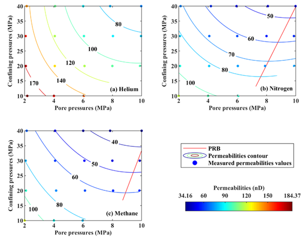 圖1 氦氣、氮?dú)夂图淄榈谋碛^滲透率差異