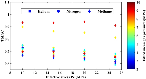 圖2 甲烷吸附導(dǎo)致甲烷切向動(dòng)量轉(zhuǎn)換系數(shù)(TMAC)明顯大于氦氣和氮?dú)?/span>