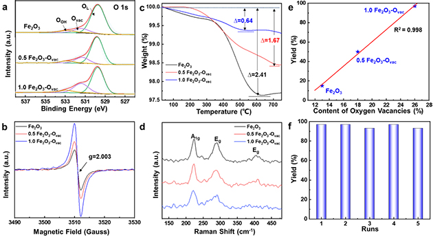 圖二 . Fe2O3-Ovac催化劑中氧空位的表征(a-d),空位濃度和活性的關(guān)系(e)以及催化劑的重復(fù)使用(f)