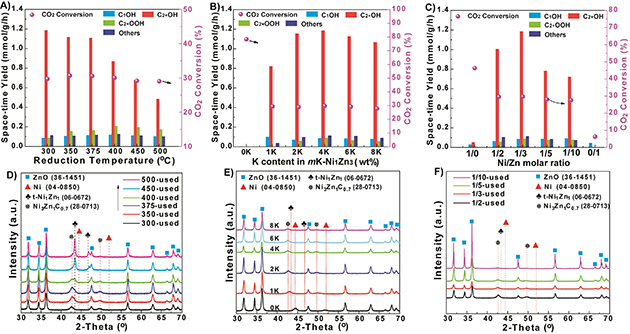 圖3.不同參數(shù)催化劑的催化性能及反應后催化劑的XRD結果:(A)&(D) 不同催化劑還原溫度; (B)&(E)不同K負載量;(C)&(F)不同Ni/Zn摩爾比