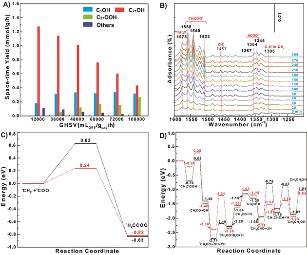 圖4.(A)不同空速條件下的催化性能; (B)原位DRIFTS監(jiān)測反應過程;DFT模擬C-C偶聯(lián)過程(C)與*CH3COO加氫形成CH3CH2OH過程(D),