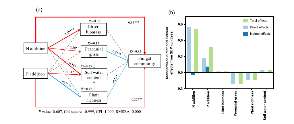 圖3 結(jié)構(gòu)方程模型描述了氮添加和磷添加對(duì)真菌群落結(jié)構(gòu)的直接和間接影響