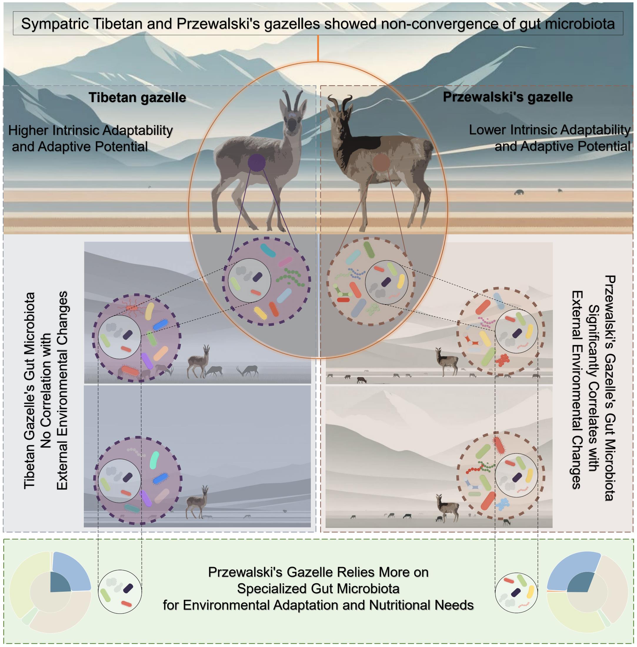為闡明宿主瀕危程度與腸道微生物依賴性之間的關(guān)系,中國(guó)科學(xué)院西北高原生物研究所動(dòng)物生態(tài)與資源保護(hù)研究團(tuán)隊(duì)以藏原羚(近危)和普氏原羚(瀕危)為研究對(duì)象,通過(guò)16S rRNA擴(kuò)增子測(cè)序技術(shù)進(jìn)行高通量測(cè)序,深入探究了這兩個(gè)物種在相同和不同環(huán)境條件下的腸道微生物多樣性和組成,群落組裝機(jī)制以及預(yù)測(cè)功能的變化。研究結(jié)果表明,相較于異域分布的種群,同域分布的藏原羚和普氏原羚種群的腸道微生物多樣性和組成并未因共享相同環(huán)境而呈現(xiàn)顯著的趨同。進(jìn)一步分析發(fā)現(xiàn),藏原羚和普氏原羚腸道微生物與宿主外部環(huán)境變化的關(guān)系存在明顯的區(qū)別,瀕危等級(jí)更高的普氏原羚腸道微生物群落結(jié)構(gòu)變異與環(huán)境條件的改變顯著相關(guān),而在瀕危等級(jí)較低的藏原羚中,這種相關(guān)性則不顯著。利用iCAMP對(duì)兩物種腸道微生物群落的組裝過(guò)程進(jìn)行定量分析,結(jié)果顯示普氏原羚腸道微生物群落的組裝過(guò)程相比藏原羚更偏向于同質(zhì)選擇過(guò)程(HoS)。對(duì)促進(jìn)這一轉(zhuǎn)變的微生物類群進(jìn)行分析,發(fā)現(xiàn)在普氏原羚中貢獻(xiàn)了同質(zhì)選擇,但在藏原羚中貢獻(xiàn)了其他過(guò)程(如隨機(jī)漂變、擴(kuò)散限制、異質(zhì)分散或異質(zhì)選擇)的ASVs主要隸屬于顫螺旋菌科、coprostanoligenes group、克里斯滕森菌科、阿克曼氏菌科和拉克諾斯菌科。對(duì)這些ASVs進(jìn)行功能預(yù)測(cè)及KEGG富集分析,結(jié)果表明,其主要與營(yíng)養(yǎng)物質(zhì)代謝、合成以及免疫調(diào)節(jié)密切相關(guān),提示這些ASVs可能在宿主營(yíng)養(yǎng)物質(zhì)利用和免疫功能維持等方面發(fā)揮著重要作用。研究認(rèn)為瀕危等級(jí)較高的普氏原羚更依賴腸道微生物所提供的“生態(tài)系統(tǒng)服務(wù)”以應(yīng)對(duì)環(huán)境的變化。這種依賴性可能源于瀕危物種通常適應(yīng)性和適應(yīng)潛力較低,腸道微生物在其適應(yīng)和應(yīng)對(duì)環(huán)境變化中發(fā)揮了重要的補(bǔ)償作用。本研究在揭示宿主瀕危程度與腸道微生物依賴性的關(guān)系的同時(shí),也為瀕危物種保護(hù)和管理提供了新的視角和策略。