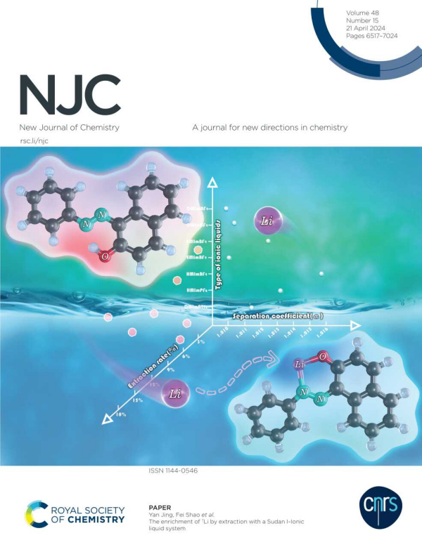 中國(guó)科學(xué)院青海鹽湖研究所同位素分離與化學(xué)品精制課題組針對(duì)蘇丹Ⅰ(1-苯基偶氮-2-萘酚)萃取富集7Li分離效應(yīng)低問題開展研究。基于離子液體在鋰同位素分離體系中表現(xiàn)出優(yōu)異的協(xié)萃性能,將離子液體引入蘇丹Ⅰ體系中,構(gòu)建蘇丹離子液體(Ⅰ-[HMIm][BF4])萃取體系,極大提高了蘇丹Ⅰ對(duì)7Li的分離能力。蘇丹Ⅰ與Li+是1:1進(jìn)行絡(luò)合,過程中離子液體在跨界面遷移中主要起輔助作用,離子液體陰離子親水性越強(qiáng),其輔助萃取作用越強(qiáng),且計(jì)算表明離子液體的陰離子極有可能參與了蘇丹Ⅰ與鋰離子的配位。此研究成果在New Journal of Chemistry期刊發(fā)表封面學(xué)術(shù)論文一篇,SCI收錄。