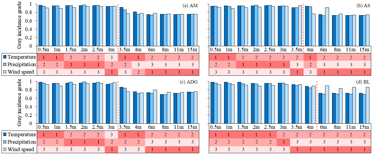 研究表明,在時頻域中,青藏高原不同類型高寒草地的多年凍土溫度在氣候多時間尺度的控制下呈現(xiàn)出多時間尺度特征,活動層溫度的變化主要受月氣候變化的影響,而多年凍土溫度的變化則主要受年氣候變化的影響。氣溫、降水和風速對不同深度的多年凍土溫度有著不同程度的影響,尤其在深層部分,風速對多年凍土的影響尤為突出(圖2)。