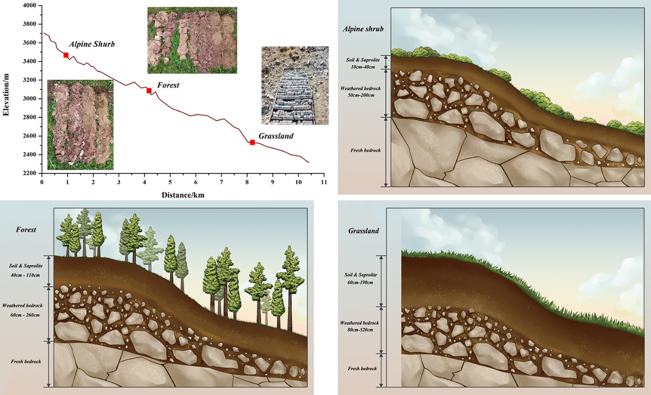 中國科學(xué)院西北生態(tài)環(huán)境資源研究院科研團隊對祁連山典型小流域土壤和基巖風(fēng)化層特征進行了全面調(diào)查,分析了不同景觀單元下基巖風(fēng)化層結(jié)構(gòu)和儲水能力的變化,驗證了基巖風(fēng)化層儲水對徑流和植物用水的調(diào)節(jié)作用。