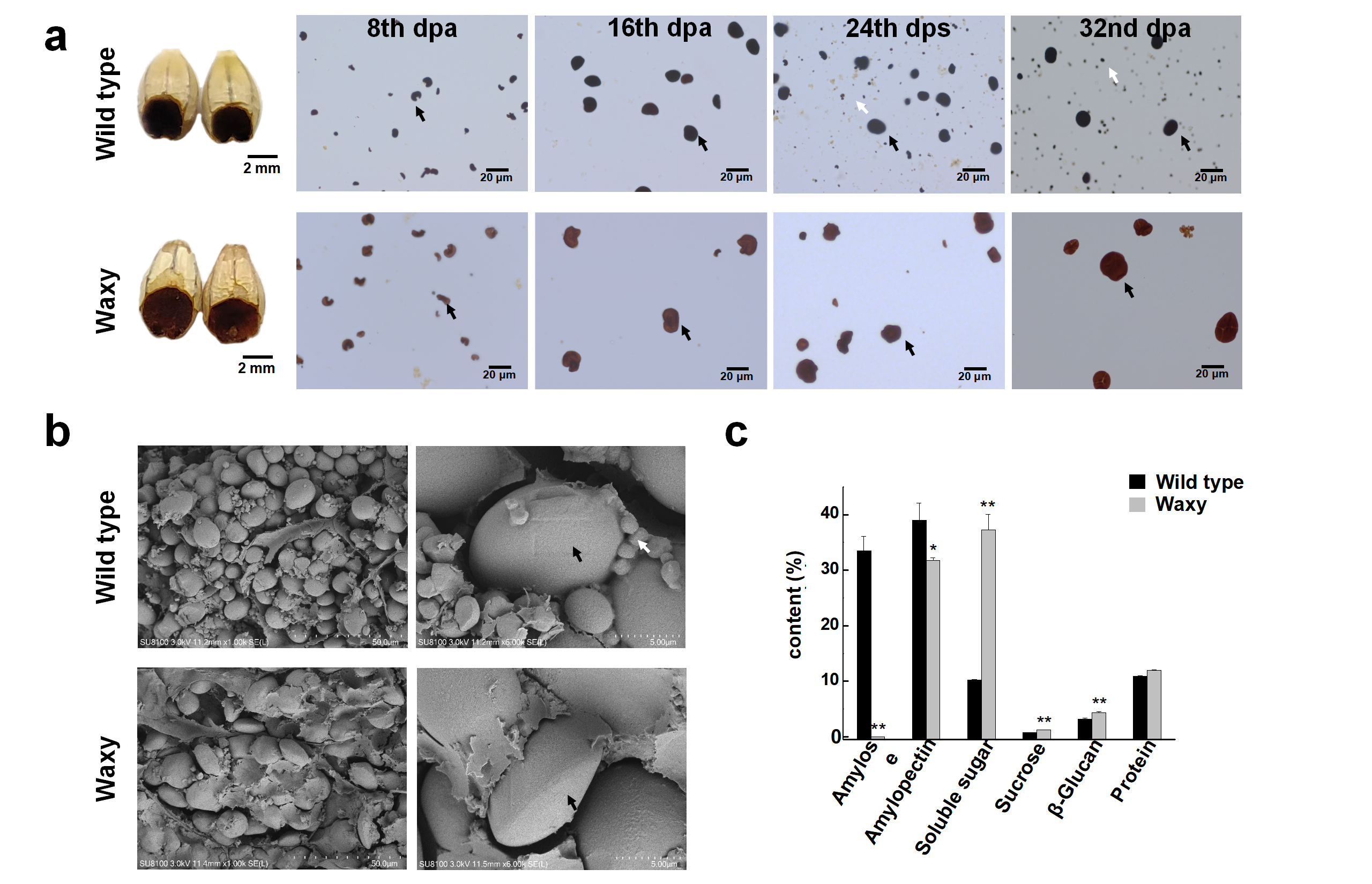 a:胚乳特征和淀粉粒顯微觀察;b:淀粉粒掃描電鏡觀察;c:籽粒各組分含量
