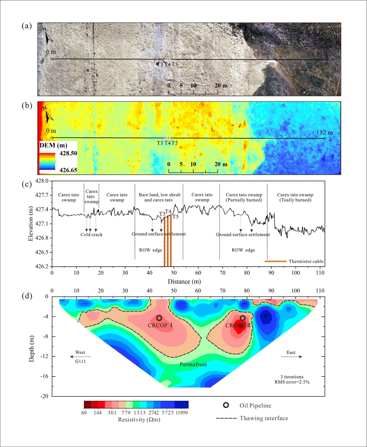(c)地形、植被、鉆孔、管權范圍和凍土災害等信息 (d) ERT反演結果