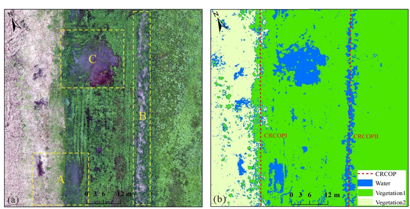圖3 管道沿線積水分布?。╝)無人機正射影像 (b)影像監(jiān)督分類結果