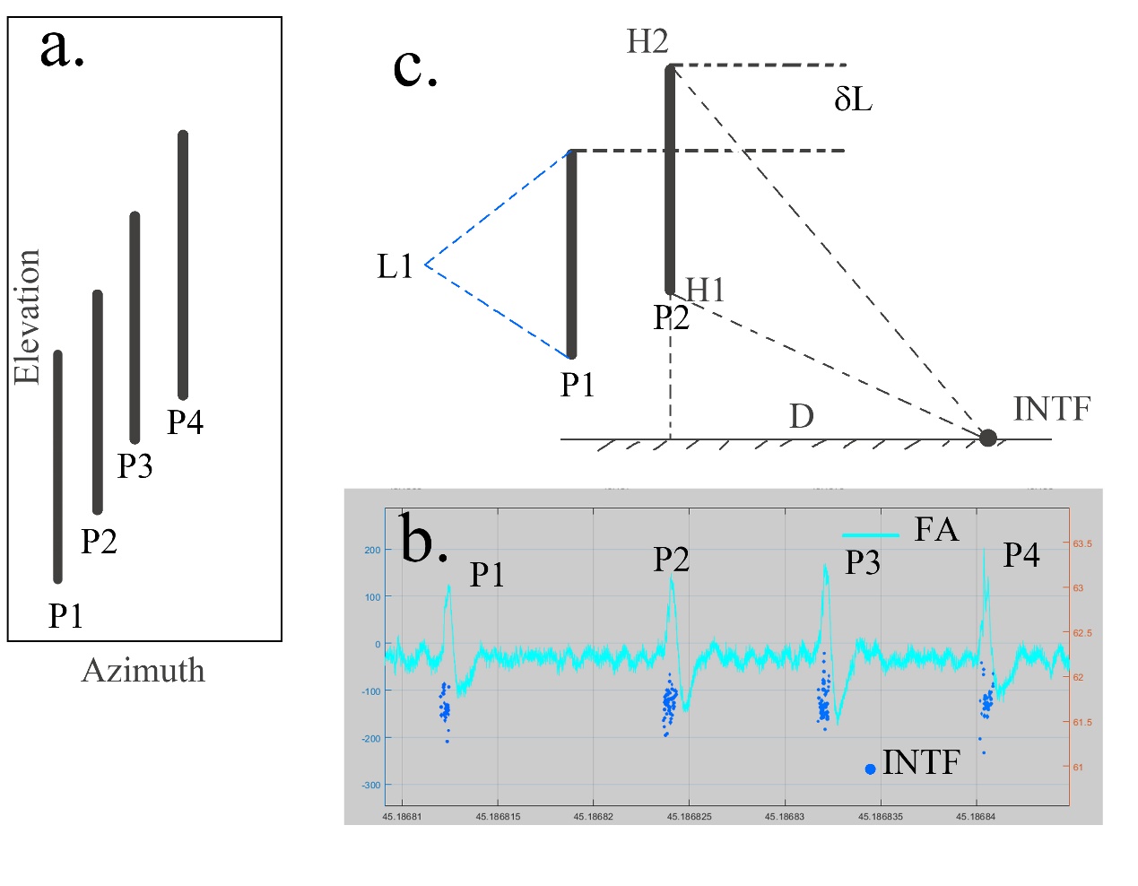 圖2. VHF干涉儀(Fan et al.,2023a;2023b)對規(guī)則脈沖爆發(fā)序列中連續(xù)脈沖的二維觀測結(jié)果,顯示這些脈沖比正常的直竄先導(dǎo)速度更快,并且從一個脈沖到另一個脈沖之間重疊較強(qiáng)?。╝)。從平面距離 D?。健?.8 公里和干涉儀仰角的差異(例如,60.5° 和 60°),可以得出脈沖的 VHF輻射源的垂直范圍約為 205 米?。╟)。這一現(xiàn)象發(fā)生在約 2 微秒的時間間隔內(nèi),對應(yīng)的速度約為 108 米/秒。脈沖代表的擊穿速度遠(yuǎn)高于已知的閃電先導(dǎo)通道發(fā)展速度。
