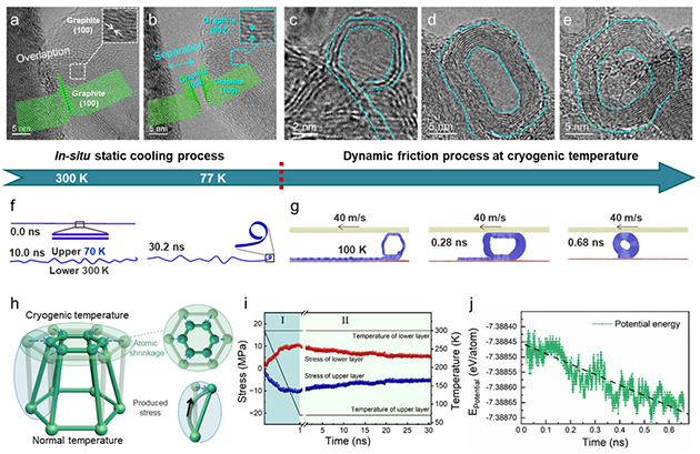 近期,中國科學(xué)院蘭州化學(xué)物理研究所蘭州潤滑材料與技術(shù)創(chuàng)新中心磨損與表面工程課題組和潤滑材料重點(diǎn)實(shí)驗(yàn)室計(jì)算摩擦學(xué)課題組合作在超低溫下石墨摩擦界面演變與分子滾動(dòng)潤滑機(jī)理研究方面取得重要進(jìn)展。研究團(tuán)隊(duì)發(fā)現(xiàn)了超低溫下石墨納米片自卷曲與分子滾動(dòng)潤滑的現(xiàn)象,揭示了分子滾動(dòng)潤滑的界面電子作用機(jī)理,為從分子尺度認(rèn)識與控制摩擦現(xiàn)象提供了新的認(rèn)知和設(shè)計(jì)原理。