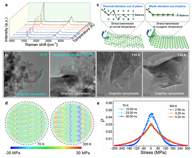 結(jié)合實(shí)驗(yàn)和理論模擬系統(tǒng),研究團(tuán)隊(duì)研究了石墨納米片邊緣自卷翹形變的影響因素、結(jié)構(gòu)演變和形成機(jī)理。結(jié)果表明,超低溫環(huán)境下,非平衡溫度場導(dǎo)致了原子的不均勻收縮,石墨片上下表面產(chǎn)生了方向相反的應(yīng)力,驅(qū)動(dòng)了石墨片邊緣的自卷翹;同時(shí)發(fā)現(xiàn)熱振動(dòng)對原子間應(yīng)力傳遞的耗散作用,當(dāng)溫度低于100K時(shí),原子熱振動(dòng)顯著減弱,原子間應(yīng)力傳遞耗散被抑制,促進(jìn)了石墨納米片自卷翹形變的發(fā)生。該研究將為認(rèn)識微觀粒子受力傳遞規(guī)律和納米形變機(jī)理提供新的理解,同時(shí)發(fā)現(xiàn)了一種利用溫度操控自卷曲納米形變行為的新方法,在潤滑、傳感等眾多領(lǐng)域具有廣泛應(yīng)用價(jià)值。