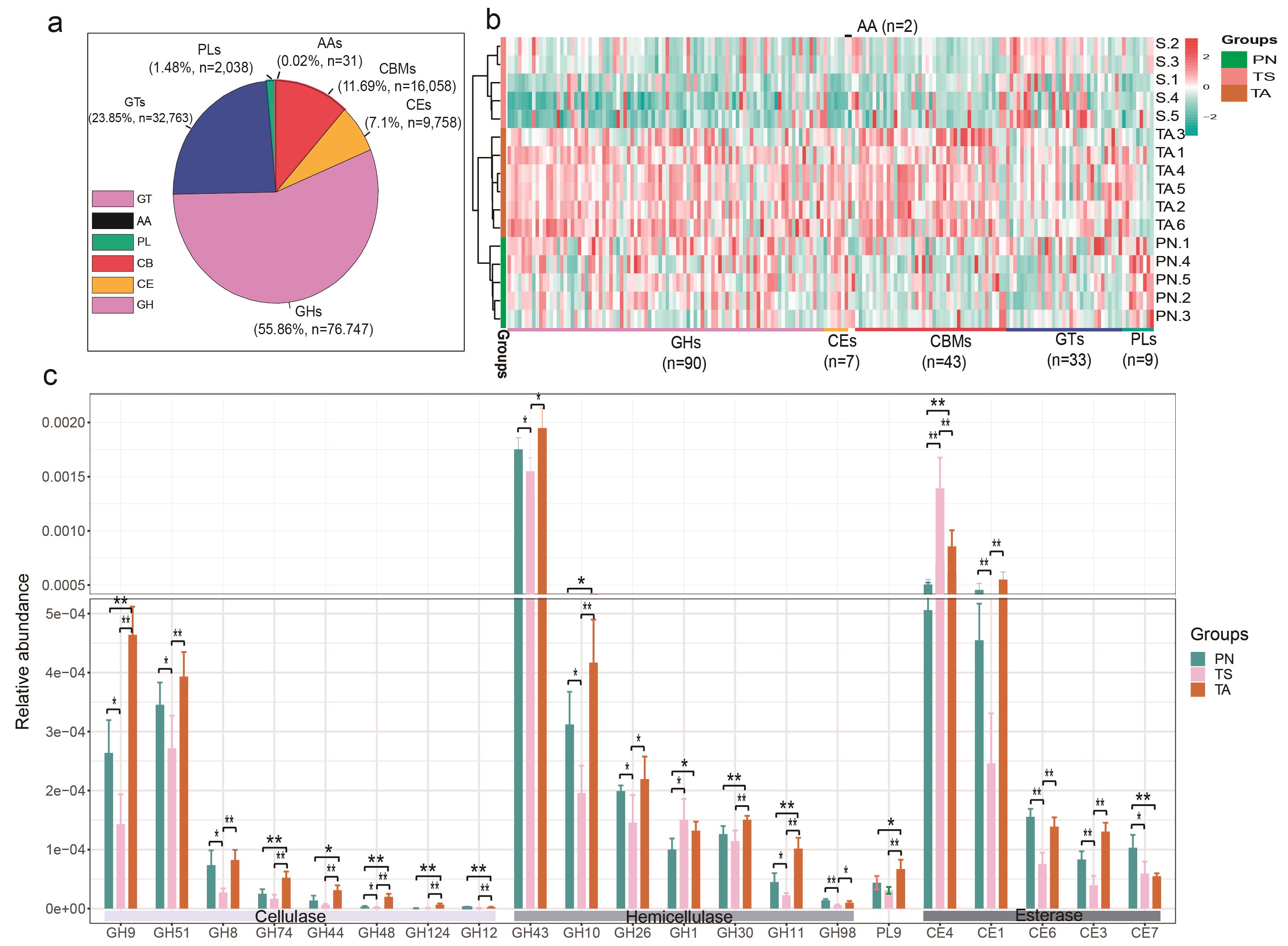 不同小反芻動物CAZYme酶基因分布特征。(a) unigenens 整體分布狀況;(b)糖苷水解酶(GHs)、糖基轉(zhuǎn)移酶(GTs)、多糖裂解酶(PLs)、碳水化合物酯酶(CEs)及碳水化合物結合模塊(CBMs)富集分析;(c)不同小反芻動物腸道菌群有關纖維素酶、半纖維素酶及酯酶基因顯著性分析