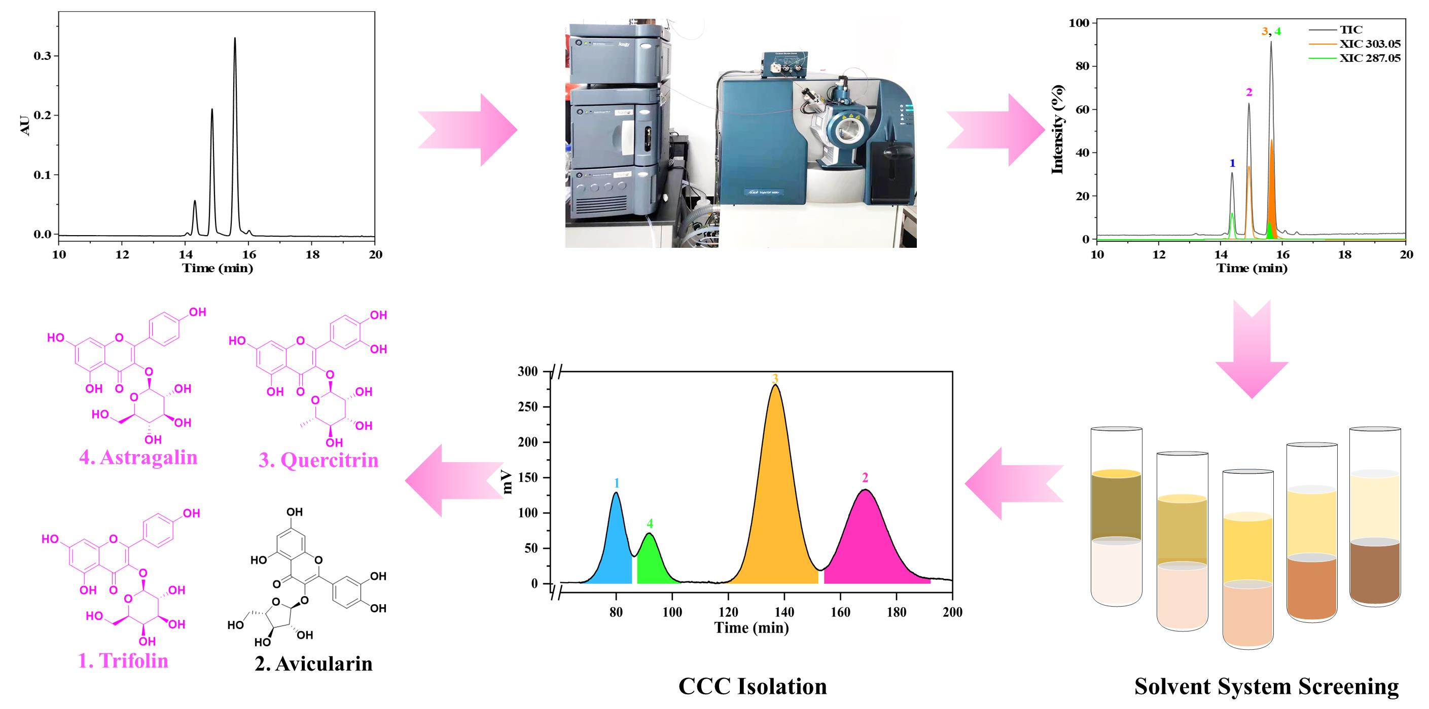 另外,由于天然產(chǎn)物組成成分和結(jié)構(gòu)復(fù)雜多樣,常常會(huì)出現(xiàn)色譜共洗脫現(xiàn)象,難以被發(fā)現(xiàn)、分析和分離。針對(duì)這一挑戰(zhàn),研究團(tuán)隊(duì)提出一種基于UPLC-QTOF-MS/MS和CCC的HPLC共洗脫異構(gòu)體的差異識(shí)別和靶向分離策略。通過UPLC-QTOF-MS/MS實(shí)現(xiàn)了對(duì)共洗脫異構(gòu)體的差異特征精確識(shí)別和準(zhǔn)確定量,解決了共洗脫異構(gòu)體無法進(jìn)行CCC溶劑系統(tǒng)篩選的關(guān)鍵技術(shù)問題?;诖瞬呗?,成功從唐古特大黃葉中分離得到astragalin等四種高純度的黃酮類化合物,其中三個(gè)互為異構(gòu)體。該研究為天然產(chǎn)物分離過程中共洗脫異構(gòu)體的分析和分離提供了新的思路。