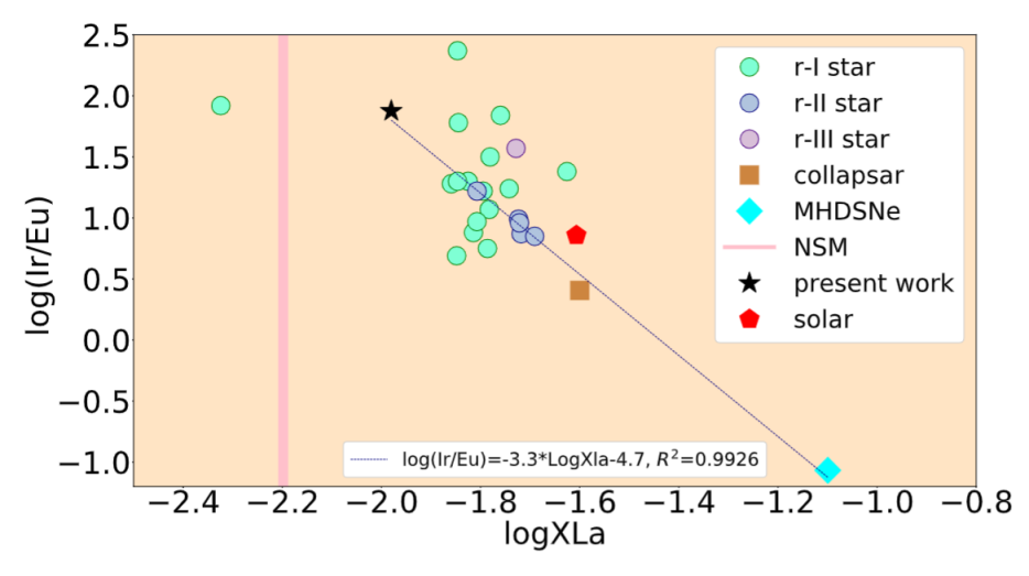 研究人員發(fā)現(xiàn)CEJSNe是目前最強(qiáng)的超鑭元素合成地點(diǎn)。在提取了被標(biāo)定為r-過(guò)程增強(qiáng)星的天文觀測(cè)量及相關(guān)理論模型值后,研究發(fā)現(xiàn) CEJSNe與其它理論模型呈現(xiàn)出很好的反關(guān)聯(lián)關(guān)系。這表明,豐富的稀土元素和超鑭元素不能同時(shí)出現(xiàn)在同一次r-過(guò)程核合成中。研究同時(shí)指出,如果沒(méi)有CEJSNe,r-過(guò)程增強(qiáng)星的觀測(cè)值將很難被理論模型解釋,因此該研究進(jìn)一步提升了r-過(guò)程核合成理論的完備性。