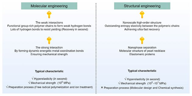 圖1. 強(qiáng)韌水凝膠和超彈性水凝膠在力學(xué)機(jī)制和性能方面的差異