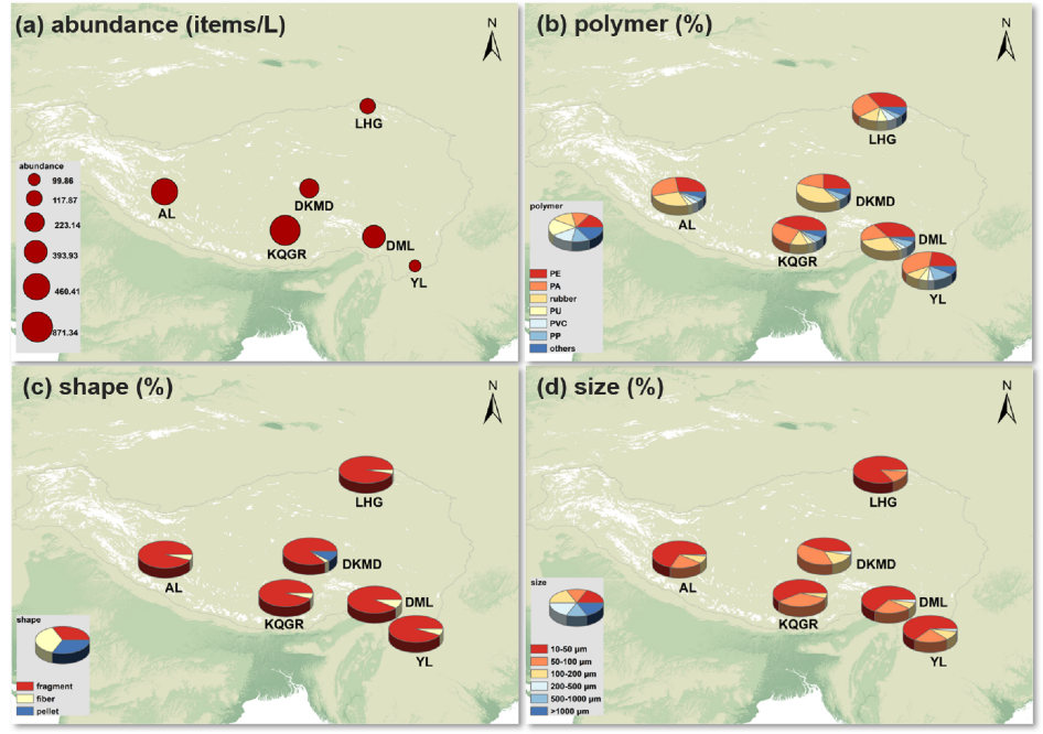 圖1 青藏高原典型冰川雪坑中微塑料的特征。其中:(a) 微塑料豐度,(b) 微塑料聚合物成分,(c) 微塑料形狀,(d) 微塑料尺寸分布。(YL-白水河1號冰川、DML-德姆拉冰川、KQGR-闊瓊崗日冰川、AL-昂龍冰川、DKMD-冬克瑪?shù)妆?、LHG-老虎溝12號冰川)。(Wang Z et al.,2024)