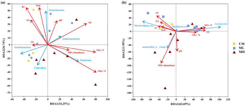 高通量測序分析表明,塑料圈中的α多樣性(Chao1和香農(nóng)指數(shù))低于土壤中的α多樣性,且隨土壤中微塑料豐度的變化而顯著不同。隨著微塑料豐度的增加,土壤中有機質(zhì)降解類群和光自養(yǎng)類群的比例也隨之增加,并顯示在塑料圈中富集。功能預測進一步表明,微塑料的豐度影響了土壤的潛在功能,如與碳和氮循環(huán)相關的代謝途徑。與土壤環(huán)境相比,塑料圈中與有機物降解相關的功能豐度較高,且塑料圈的潛在健康風險更高。根據(jù)冗余(RDA)分析,可以確定環(huán)境理化性質(zhì)和微塑料豐度對真菌群落的影響大于對細菌群落的影響(圖3)。這表明,微塑料豐度會影響微生物多樣性組成,并可能影響土壤生態(tài)系統(tǒng)的整體性能。