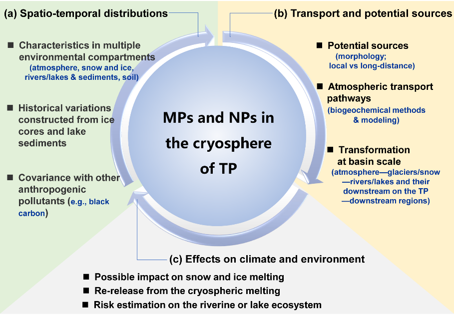 微塑料在雪冰、水體、土壤、沉積物、大氣等環(huán)境中廣泛分布,被認為是全球重要新污染物之一。青藏高原冰凍圈地區(qū)遠離人類活動密集區(qū),是研究污染物來源、傳輸以及影響的天然實驗室。開展青藏高原冰凍圈地區(qū)不同環(huán)境介質(zhì)中微塑料分布特征以及環(huán)境效應的研究,能夠提升對微塑料污染全球影響的認識。