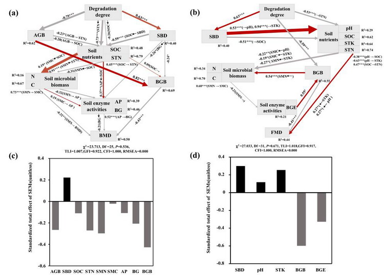 三江源高寒草甸土壤細(xì)菌多樣性(a, c)和真菌多樣性(b, d)的結(jié)構(gòu)方程模型