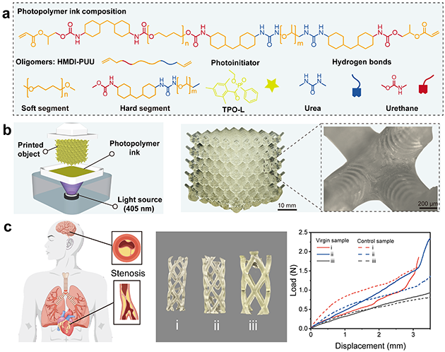 研究人員通過在聚氨酯前驅體中引入了脲基和酯基,發(fā)展了多重氫鍵誘導的可快速光固化3D打印的超分子聚氨酯彈性體,獲得的彈性體具有優(yōu)異的高彈性、高強度、韌性以及良好的生物相容性和血液相容性。具有高精度光固化3D打印性能的聚氨酯彈性體綜合了高性能與快速結構制造方面的優(yōu)勢,為具有優(yōu)異抗壓縮承載能力和機械穩(wěn)定性等特性的復雜柔性結構生物醫(yī)療器械的制造提供了新的材料技術方案。