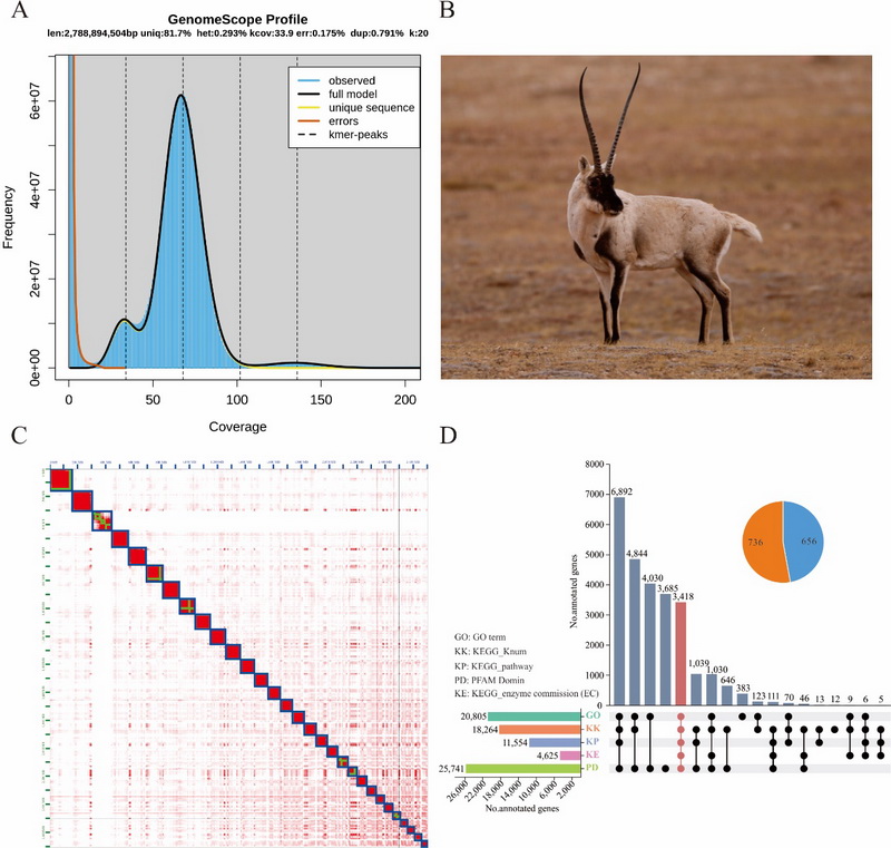 中國科學(xué)院西北高原生物研究所動物生態(tài)與資源保護(hù)研究團(tuán)隊聯(lián)合青海大學(xué),基于PacBio HiFi三代基因組測序、Hi-C測序和DNBSEQ-T7二代基因組survey測序三種測序技術(shù),成功組裝了藏羚染色體級別的基因組。結(jié)果顯示,藏羚基因組大小為3.1 Gb,Contig N50為84.6 Mb,所有基因掛載到30條染色體上(29 + X),與之前的核型研究一致。數(shù)據(jù)評估顯示,藏羚基因組BUSCO得分為98.2%(S:92.3%,D:5.9%,F(xiàn):0.8%,M:1.0%),平均QV值為70.14,表明組裝的連續(xù)性好,完整度和準(zhǔn)確性高?;贓DTA和RepeatModeler從頭預(yù)測的藏羚基因組中重復(fù)序列注釋結(jié)果表明,藏羚基因組重復(fù)序列主要由SINEs、LINEs、LTRs 和DNA transposons四種類型組成,序列總長度為1.65 Gb,占基因組的52.47%;基于蛋白同源預(yù)測、蛋白從頭預(yù)測和深度學(xué)習(xí)等多種策略,在藏羚基因組上共注釋到28,330個功能基因。綜上,通過多種技術(shù)手段,首次獲得了藏羚染色體水平的高質(zhì)量基因組和注釋信息,為藏羚的適應(yīng)進(jìn)化遺傳機(jī)制、保護(hù)遺傳學(xué)研究及進(jìn)一步探索物種遷徙行為的遺傳機(jī)制提供了重要的基因組資源。