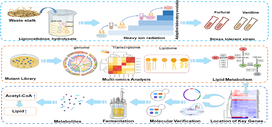 基于此現(xiàn)狀,科研人員利用蘭州重離子加速器(HIRFL)對目標(biāo)突變體實(shí)施多輪輻射,結(jié)合ALE技術(shù)提高了酵母的抗逆性和耐受性,因此獲得了適應(yīng)性更強(qiáng)的底盤細(xì)胞。再通過多組學(xué)聯(lián)合分析方法識別出與其發(fā)酵性能相關(guān)的重要基因,利用基因編輯技術(shù)對代謝通路進(jìn)行精準(zhǔn)優(yōu)化,著重優(yōu)化了核心代謝中間產(chǎn)物的代謝通量,使乙酰輔酶A水平較之前提高了17.10%,從而顯著提高了酵母在合成脂類和其他高附加值化合物方面的產(chǎn)量。