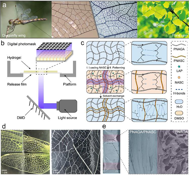 近日,中國(guó)科學(xué)院蘭州化學(xué)物理研究所潤(rùn)滑材料重點(diǎn)實(shí)驗(yàn)室受自然界中廣泛存在的圖案化異質(zhì)結(jié)構(gòu)(如昆蟲(chóng)翅膀和植物葉脈等)啟發(fā),發(fā)展了一種圖案化水凝膠(CSN水凝膠)方案實(shí)現(xiàn)了其多屬性、寬范圍的力學(xué)性能調(diào)控。如圖1所示,研究人員以光固化聚(N-丙烯酰甘氨酰胺)(PNAGA)水凝膠作為軟基質(zhì),通過(guò)先浸泡N-丙烯?;被澹?/span>NASC)前驅(qū)體溶液再以選區(qū)曝光構(gòu)建圖案化硬骨架(PNAGA@PNASC),然后經(jīng)后續(xù)水平衡過(guò)程中的相轉(zhuǎn)化誘導(dǎo)氫鍵重構(gòu)實(shí)現(xiàn)軟基質(zhì)和硬骨架的無(wú)縫互鎖,發(fā)展了具有局部互穿網(wǎng)絡(luò)的圖案化硬骨架強(qiáng)化水凝膠。