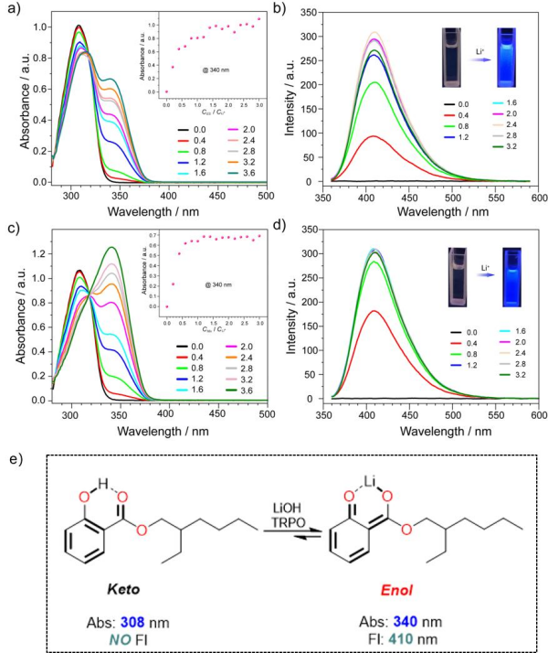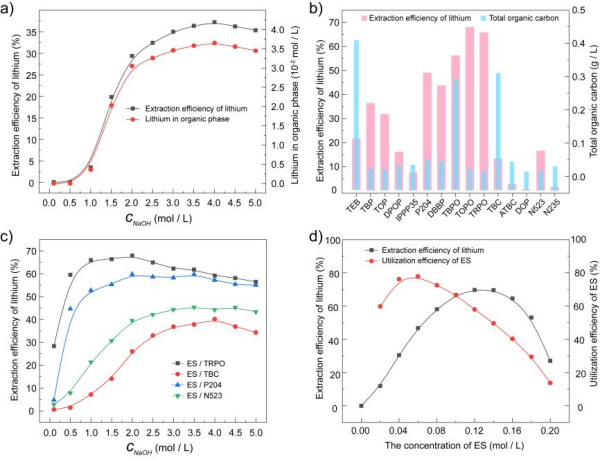 中國科學(xué)院青海鹽湖研究所研究團隊對2-乙基己基水楊酸(ES)和三烷基磷酸氧化物(TRPO)混合萃取體系進行了平衡、過程和機理研究。系統(tǒng)研究了影響鋰萃取的因素,如有機相組成、水相條件、萃取時間和ES萃取系統(tǒng)的酸堿耐受性。通過平衡研究,設(shè)計了從碳酸鋰母液中回收鋰的整個過程,包括萃取、洗滌、剝離和再生,并成功回收了99%的鋰,得到了含25.85 g/L鋰和0.08 g/L鈉的鋰富集溶液。研究表明,萃取過程是熱力學(xué)自發(fā)的熵增過程,在分子水平上,通過紫外-可見光譜(UV–Vis)、熒光光譜(Fl)、核磁共振(1H NMR)和傅里葉變換紅外光譜(FT-IR)闡明了配位機制。