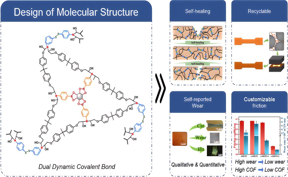 近日,研究人員通過動(dòng)態(tài)可逆的分子結(jié)構(gòu)設(shè)計(jì),實(shí)現(xiàn)了一種具有自愈合、可回收、自報(bào)告磨損和可定制摩擦的多功能熱固性環(huán)氧樹脂。基于動(dòng)態(tài)共價(jià)鍵的可逆交換,環(huán)氧玻璃體可通過熱壓實(shí)現(xiàn)回收和損傷修復(fù),而無(wú)需額外的粘合劑或催化劑。此外,利用動(dòng)態(tài)共價(jià)鍵的可逆性,將具有特定摩擦學(xué)特性的納米填料(氧化石墨烯和聚四氟乙烯)納入回收過程,以實(shí)現(xiàn)可定制的摩擦系數(shù)和耐磨損性能。不僅如此,研究人員利用二硫鍵的動(dòng)態(tài)性質(zhì),實(shí)現(xiàn)了基于硫自由基的磨損自報(bào)告特性,還研究了磨損時(shí)間與磨損狀態(tài)之間的關(guān)系。