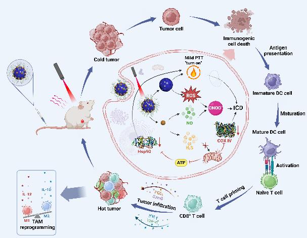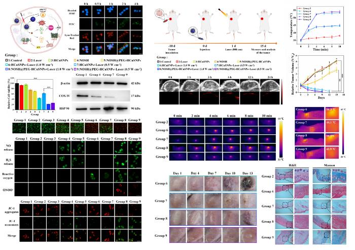 該研究利用雙模態(tài)探針和熒光-質(zhì)譜成像聯(lián)用動態(tài)可視化技術(shù),揭示了三重協(xié)同抗腫瘤的作用機制。結(jié)果表明,利用納米馬達,通過中空硫化銅納米顆粒HCuSNPs負(fù)載氣體信號分子供體NOSH,在808 nm激光照射下可控釋放H?S/NO,同時高效轉(zhuǎn)換光能(光熱轉(zhuǎn)化效率達27.8%),確保局部溫度維持在45℃以下,既能殺傷腫瘤細胞,又避免正常組織損傷。此外,該納米馬達不僅通過H?S阻斷線粒體能量代謝、NO-ROS反應(yīng)生成ONOO?雙路徑誘導(dǎo)腫瘤凋亡,還可顯著重塑腫瘤免疫微環(huán)境,促進M1型巨噬細胞極化(比例提升3倍)、CTLs浸潤(增加5倍),全面提升免疫抗癌能力。