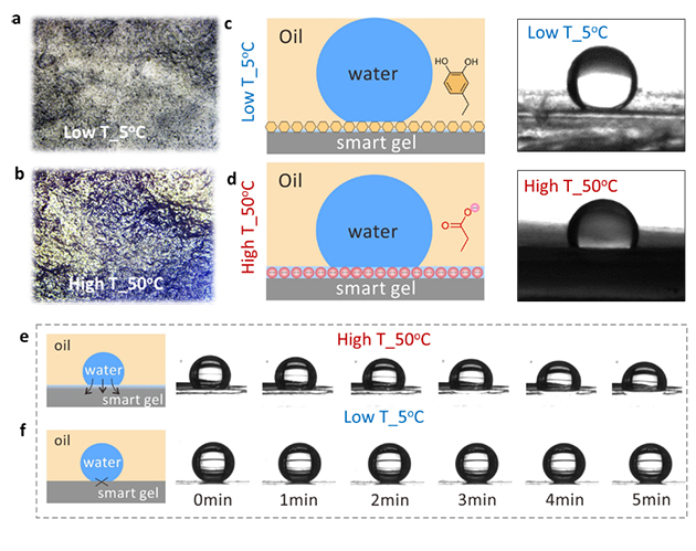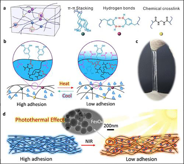 研究人員進一步揭示了其作用機制,通過近紅外光激發(fā)納米顆粒產(chǎn)生熱效應(yīng),誘導水凝膠發(fā)生溫度響應(yīng)性相變,實現(xiàn)軟物質(zhì)表面水分子的滲出/吸收,改變其表面親水羧酸基團的分子構(gòu)象,進而可逆地控制鄰苯二酚基團的屏蔽和暴露。這種基于界面分子構(gòu)象變化調(diào)控的黏附機制具有無殘留、可重復使用的特點,為智能黏附材料的開發(fā)提供了新思路。