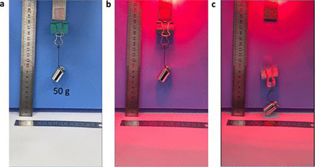 此外,該黏附水凝膠材料表現(xiàn)出優(yōu)異的智能黏附性能和廣泛的基材適用性,實現(xiàn)了從無機到有機材料表面的可逆黏附。為進一步驗證黏附水凝膠材料的可控性,研究人員實驗演示了水凝膠在不銹鋼基板上的光熱響應(yīng)行為,初始狀態(tài)下可穩(wěn)定懸掛50g重物,近紅外光照后因黏附性能切換而黏附失效。