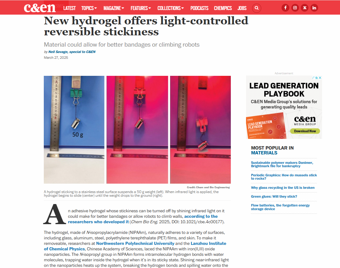 相關(guān)研究成果以“Light-controlled Adhesive Hydrogels for On-Demand Adhesion”為題發(fā)表在Chem & Bio Engineering上。同時,該成果已被美國化學學會發(fā)行的新聞周刊chemical?&?engineering?news(C&EN,全球最具權(quán)威和影響力的化學新聞來源之一。)以“New?hydrogel?offers?light-controlled?reversible?stickiness”為題報道。
