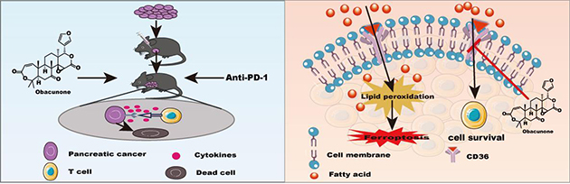 胰腺癌是一種惡性程度極高的消化系統(tǒng)腫瘤,五年生存率不足10%,目前缺乏有效的臨床治療措施,嚴重影響人類生命健康。近期,研究團隊發(fā)現(xiàn)黃柏酮能顯著增強抗PD-1免疫療法治療胰腺癌的效果,增加腫瘤組織中免疫標志物CD4+和CD8+T細胞的浸潤而抑制腫瘤生長,蛋白質組學分析發(fā)現(xiàn)黃柏酮主要通過調控CD36介導的PPAR信號通路,抑制胰腺癌PANC-1細胞CD36表達,增加CD8+ T細胞數量,促進胰腺癌細胞凋亡,從而抑制胰腺癌細胞生長。相關研究成果發(fā)表在European Journal of Pharmacology(994 (2025) 177367)上。