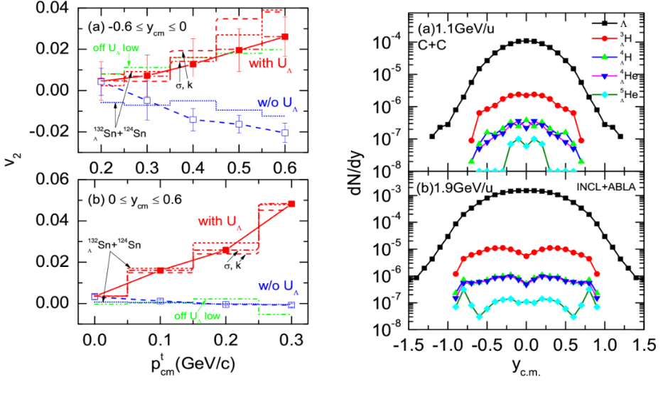 左圖:超核-原子核碰撞中的超子橢圓流隨橫動量的變化情況。上窗口對應(yīng)負(fù)快度,下窗口對應(yīng)正快度。圖中展示了不同重子散射截面、不同物態(tài)方程、超子勢的不同密度區(qū)間,以及不同的反應(yīng)系統(tǒng)對超子橢圓流的影響。右圖:碳碳碰撞中的輕超核產(chǎn)生的快度分布。上窗口對應(yīng)1.1 GeV每核子束流能的情況,下窗口對應(yīng)的是1.9 GeV情況。