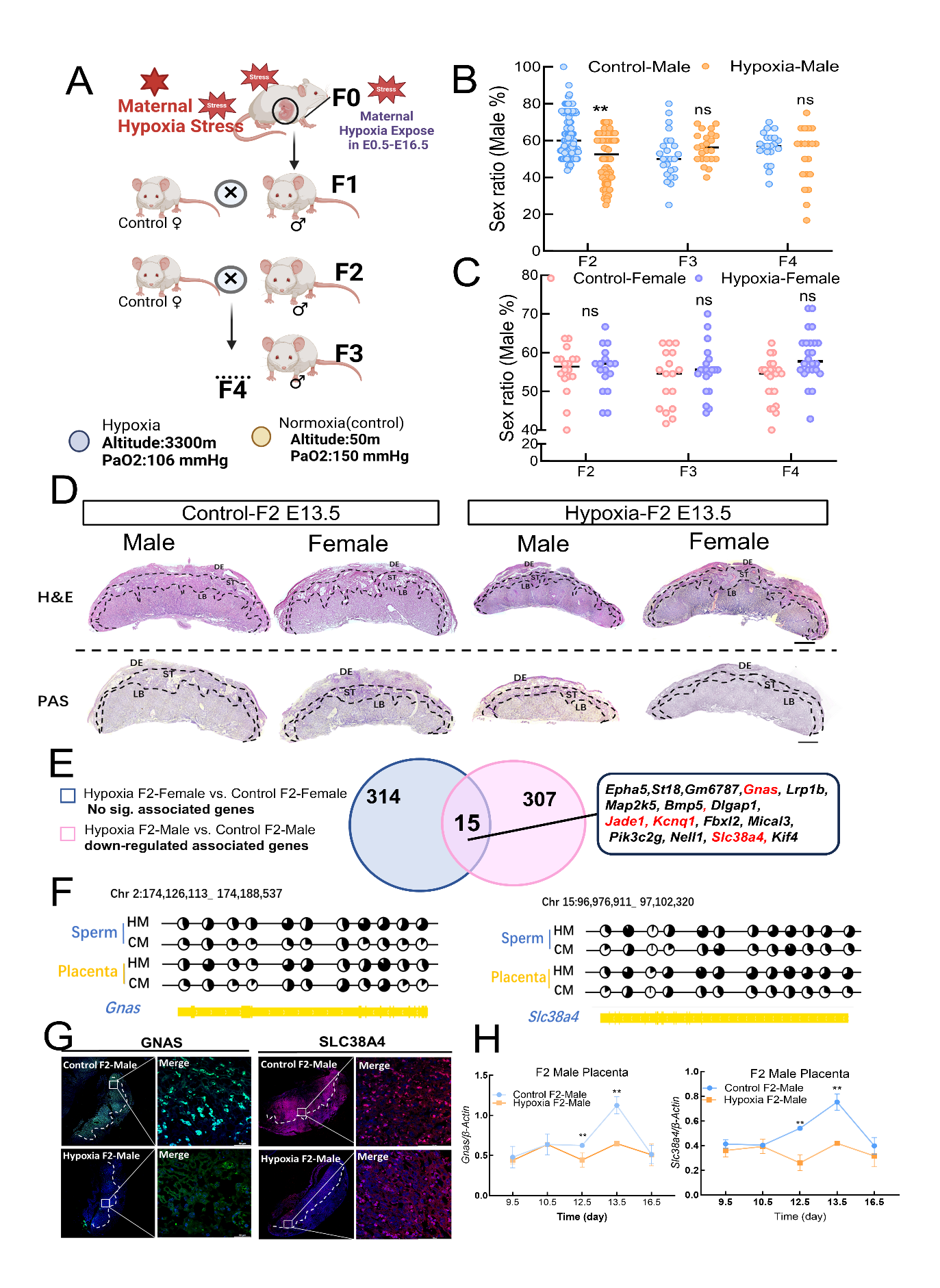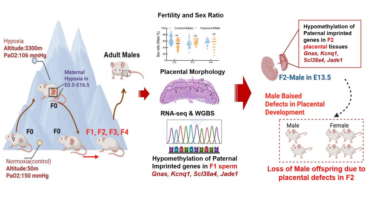 為探究母體低氧環(huán)境暴露對(duì)子代的跨代影響,中國科學(xué)院西北高原生物研究所動(dòng)物生態(tài)與資源保護(hù)研究團(tuán)隊(duì)建立了孕期低氧暴露小鼠模型,將經(jīng)歷過孕期低氧暴露的小鼠(F0)轉(zhuǎn)運(yùn)至低海拔后,出生的雄性小鼠和對(duì)照雌鼠合籠,連續(xù)飼養(yǎng)四代(F1-F4)。從2018年 9月到 2023年 8月,通過大量出生性別統(tǒng)計(jì)和不同發(fā)育階段的性別鑒定,發(fā)現(xiàn)母體孕期低氧暴露會(huì)造成F2代雄性個(gè)體顯著減少。進(jìn)一步的分析發(fā)現(xiàn)F2雄性減少是由于在胚胎期13.5天發(fā)生的胚胎特異性丟失。雄性胚胎丟失的主要原因?yàn)樘ケP形態(tài)和功能異常。研究團(tuán)隊(duì)通過胎盤轉(zhuǎn)錄組和全基因組DNA甲基化測(cè)序聯(lián)合分析,發(fā)現(xiàn)父源印記基因Slc38a4,Gnas,Jade1 和Kcnq1表達(dá)異常。隨后,通過對(duì)F1代小鼠成熟精子與F2代雄性胎盤全基因組DNA甲基化進(jìn)行聯(lián)合分析,結(jié)果發(fā)現(xiàn)以上印記基因DNA甲基化模式高度相似。這說明經(jīng)歷胚胎期低氧的F1代雄性小鼠的精子存在甲基化異常,并且可以進(jìn)一步影響F2雄性個(gè)體生長發(fā)育進(jìn)而導(dǎo)致性別比例異常。該工作系統(tǒng)地揭示母體低氧暴露對(duì)F1及F2代發(fā)育影響的跨代遺傳機(jī)制,為深入理解高原低氧暴露的生殖和健康風(fēng)險(xiǎn)提供了新的表型數(shù)據(jù)。