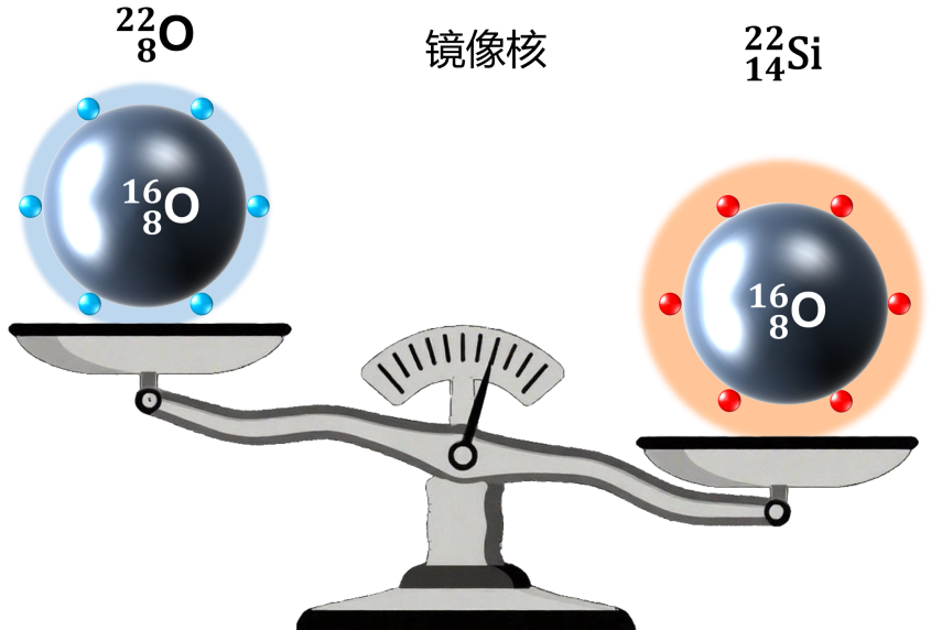 圖:硅-22及其鏡像核氧-22結(jié)構(gòu)示意圖。通過硅-22的質(zhì)量測(cè)量,結(jié)合理論計(jì)算,科研人員揭示了硅-22具有與氧-22相似的雙幻結(jié)構(gòu),但同時(shí)存在輕微的對(duì)稱破缺,具有更外延的質(zhì)子空間分布。(圖源/近代物理所)