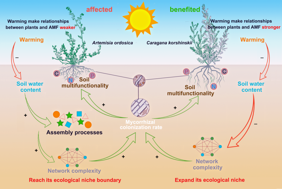 研究人員將生態(tài)位理論應(yīng)用于氣候變暖背景下,AMF群落隨機(jī)過(guò)程和網(wǎng)絡(luò)復(fù)雜性對(duì)土壤多功能性的影響中,提出了一個(gè)概念框架用以機(jī)理解釋。研究表明,兩種供試植物呈現(xiàn)出不同的功能響應(yīng)路徑。增溫導(dǎo)致土壤水分含量減少,通過(guò)“隨機(jī)性組裝-網(wǎng)絡(luò)瓦解”級(jí)聯(lián)效應(yīng)抑制了油蒿菌根定殖率(36%–79%),進(jìn)而導(dǎo)致土壤多功性下降(54%–172%),說(shuō)明油蒿AMF群落的響應(yīng)已突破其生態(tài)位閾值,隨機(jī)性組裝與網(wǎng)絡(luò)脆弱性共同驅(qū)動(dòng)了系統(tǒng)功能退化。相比之下,變暖導(dǎo)致的土壤水分含量減少通過(guò)強(qiáng)化檸條AMF網(wǎng)絡(luò)的復(fù)雜性,維持了較高的菌根侵染率(+11.3-24.5%),進(jìn)而增強(qiáng)土壤多功能性(+34-45%),檸條AMF的網(wǎng)絡(luò)復(fù)雜性驅(qū)動(dòng)土壤多功能性的增益反映了其生態(tài)位擴(kuò)展?jié)摿Α?/span>