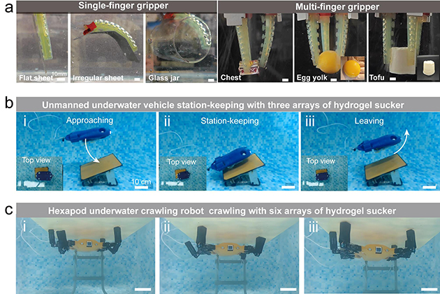 為進(jìn)一步凸顯非破壞性粘附的實(shí)用性,研究人員研制了一款采用液壓驅(qū)動(dòng)、配備仿生吸盤的水凝膠夾持器,可自適應(yīng)地操縱各種水下物體,不僅能應(yīng)對曲面復(fù)雜的物體,甚至還能溫和處理蛋黃、豆腐塊等極為脆弱的食品。 此外,研究人員將這類水凝膠吸盤陣列結(jié)構(gòu)集成到水下無人航行器的腹部和六足機(jī)器人的足端,從而賦予其水下操控物體、定點(diǎn)停留及表面爬行等特殊功能,為復(fù)雜海洋環(huán)境場景中的應(yīng)用提供了高適形、可逆、低損的粘附手段。