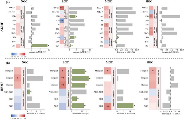 圖1?不同礫石化水平下AEMF與BEMF的相關性及主要驅動因子重要性分析