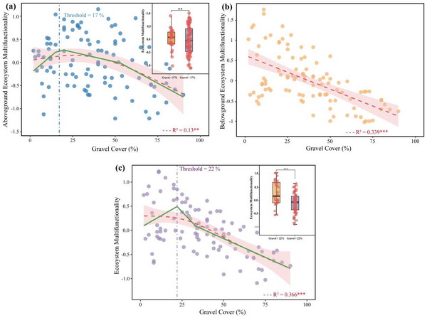 研究發(fā)現(xiàn),隨著礫石覆蓋度的增加,草地植物物種豐富度、功能群組成及生物量顯著下降,尤其是地下生物量的減少最為明顯;土壤含水量、孔隙度及養(yǎng)分含量顯著降低,而容重顯著升高,導致生態(tài)系統(tǒng)整體功能衰退。礫石化不僅直接抑制植物生長,還通過削弱土壤養(yǎng)分供給間接降低生態(tài)系統(tǒng)多功能性。隨機森林與結構方程模型分析進一步揭示,土壤養(yǎng)分和植物多樣性是決定生態(tài)系統(tǒng)多功能性的關鍵調(diào)控因子。隨礫石化程度加劇,地上功能指數(shù)(AEMF)和地下功能指數(shù)(BEMF)均顯著下降,后者的響應更為敏感,當?shù)[石覆蓋度超過22%時,生態(tài)系統(tǒng)多功能性(EMF)出現(xiàn)明顯突變性下降,表明該閾值可作為高寒草地退化的早期預警指標。研究指出,高寒草地礫石化退化過程會破壞植物-土壤耦合關系,導致生態(tài)功能的同步退化。
